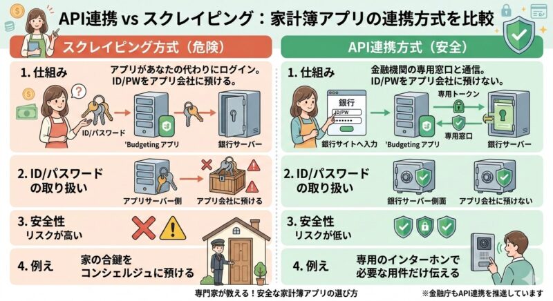 以前主流だった「スクレイピング方式」は、アプリに銀行などのIDとパスワードを預けて、あなたの代わりにログインしてもらう方法です。 言ってしまえば、家の合鍵をコンシェルジュに預けるようなもの。もしコンシェルジュの管理室が攻撃されたら、あなたの家の鍵まで盗まれてしまう危険があるのです。